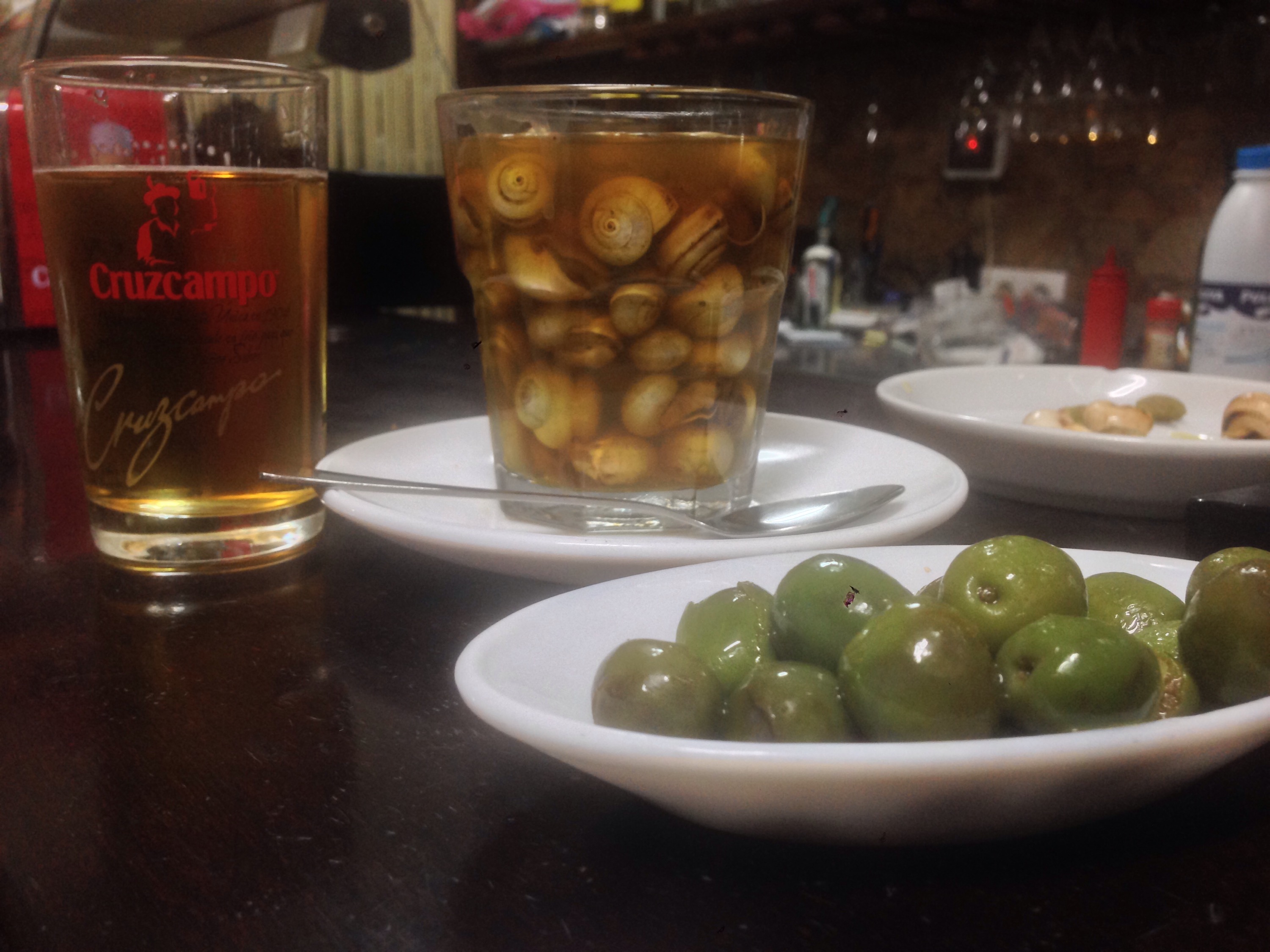 Montag: kein Frühstück in Trevélez, erst in Portugos. Danach Rucksack packen und weiter über Nerja (wer will dort Urlaub machen?) nach Málaga. Auto abgegeben und mit dem Zug reingefahren. Erst beste Unterkunft klar gemacht und dann auf die Barsuche. Gar nicht so leicht, was schönes in der Touristengegend zu finden. Nach ein paar Anlaufschwierigkeiten ist und aber auch das gelungen. Zum Abschluss gab’s sogar noch Pelegrinos (Jacobsmuscheln) und Callos (Kutteln). Und reichlich Tubos.